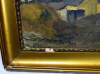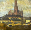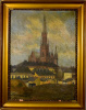 Olaj - karton, jelezve balra lent Kutasi , 1926 Budapest Thököly úti Rózsafüzér Királynéja plébániatemplom látkép, korabeli kicsit sérült keretben, kép némi elszíneződéssel, kép m.: 39,5 x 30 cm Kerettel: 46 x 37 cm